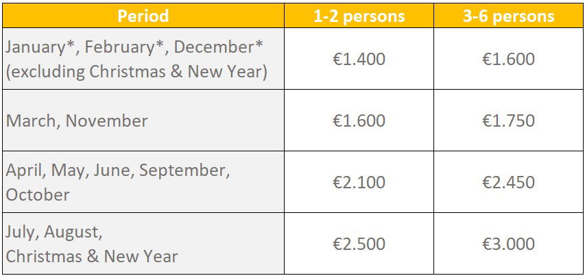 The Yellow House is available for rentals starting from 4 nights, with no fixed changeover day, allowing flexibility for arrival and departure on any day. However, during July, August, and the Christmas and New Year’s period, the minimum stay is 7 nights. Additionally, bookings during this time must either be connected to an existing reservation or have a gap of at least 7 nights between them.